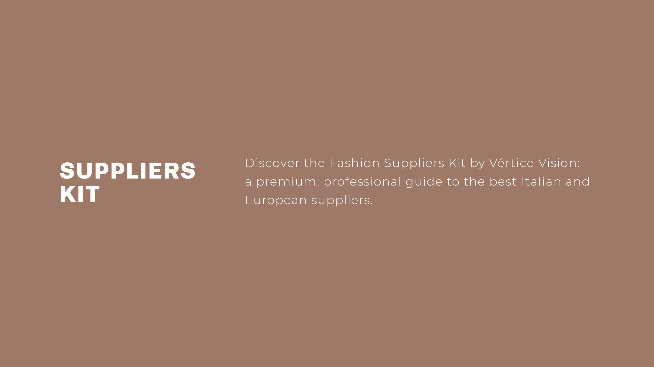 The Fashion Suppliers Kit by Vértice Vision is an indispensable tool for those who work in the fashion sector and want to build a network of reliable and high-quality suppliers. Whether you are emerging designers, growing brands or established companies, this Kit will help you save time and avoid mistakes when choosing partners.