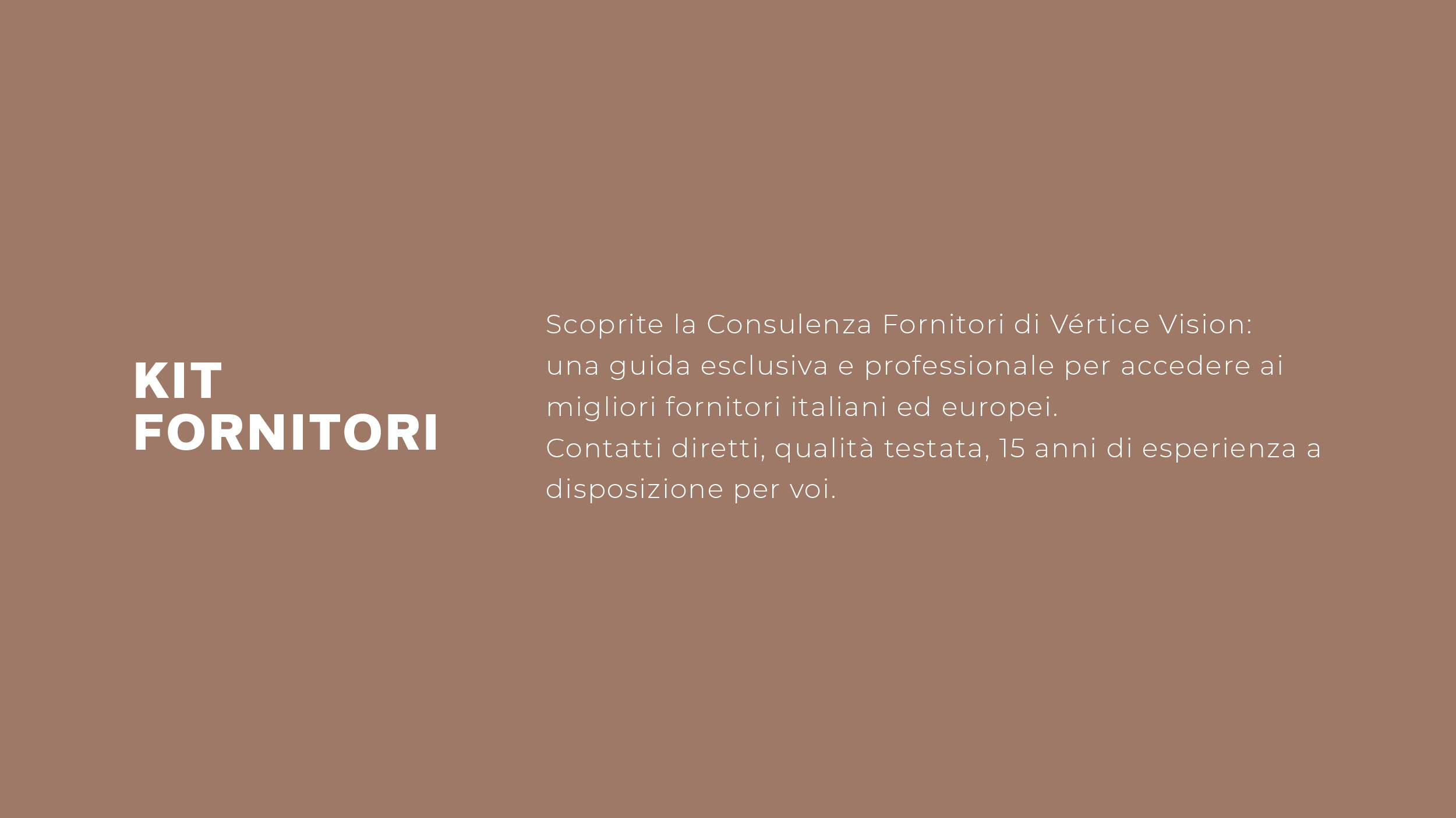 Per questo, Vértice Vision offre consulenze su misura per costruire una lista fornitori altamente qualificata, selezionata in base alle vostre reali esigenze produttive, creative e di posizionamento.